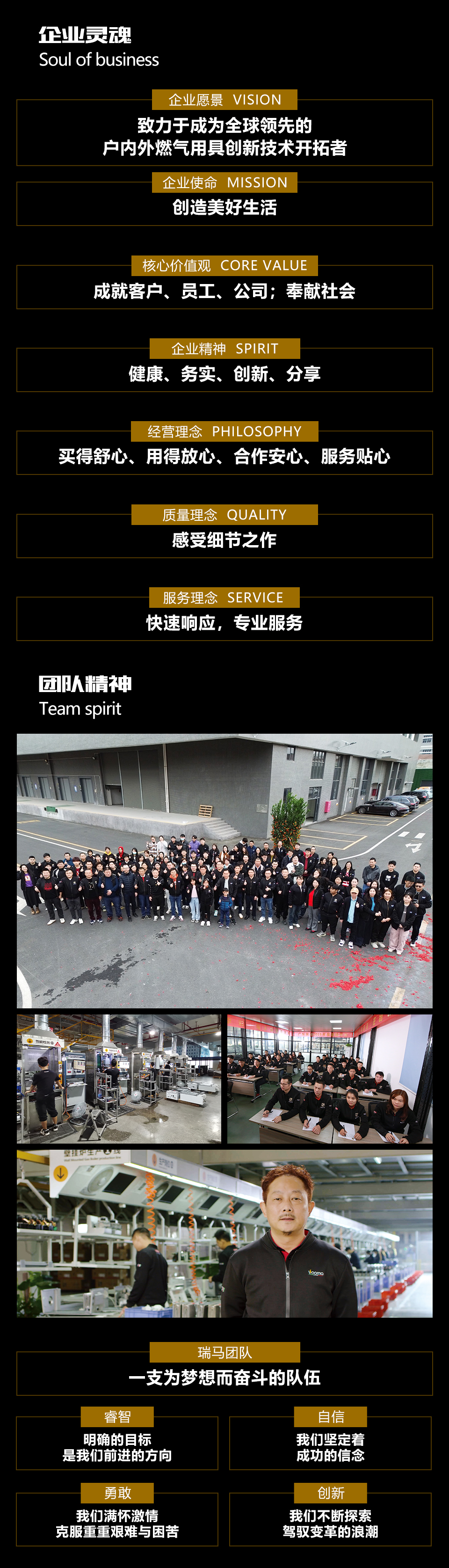 廣東瑞馬以“致力于成為全球領先的戶內外燃氣用具創新技術開拓者”為企業愿景,秉承“健康、務實、創新、分享”的企業精神,堅持“成就客戶、成就員工、成就公司、奉獻社會”的核心價值觀,堅守“感受細節之作”的質量理念,以“買得舒心、用得放心、合作安心、服務貼心”為經營理念,以“快速響應、專業服務”為服務理念,立足燃氣采暖/熱水行業,深耕燃氣應用技術,進軍戶外燃氣具領域,打造閉環“智造”工廠,以創新創造美好生活。