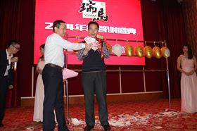 一輪熱舞過(guò)后,當(dāng)然是簡(jiǎn)單而又隆重的頒獎(jiǎng)禮。首先是頒出“2014年度優(yōu)秀經(jīng)銷商”,由馬瑞董事長(zhǎng)頒發(fā)給新疆省庫(kù)爾勒經(jīng)銷商劉海波先生,感謝他為瑞馬壁掛爐終端市場(chǎng)所作的杰出貢獻(xiàn)!接著就是“2014年度最優(yōu)秀員工獎(jiǎng)”,頒發(fā)給我們最可愛(ài)的馮興石員工。其實(shí)我們私下都喜歡稱他為“馮導(dǎo)”,特別地逗趣!也必須感謝他長(zhǎng)年累月地出差在外,為我們維護(hù)經(jīng)銷商,配合經(jīng)銷商客戶的銷售工作!看到頒獎(jiǎng)獎(jiǎng)品居然還有iphone6,我的眼睛都發(fā)亮了!瑞馬公司真的太任性,太土豪了!